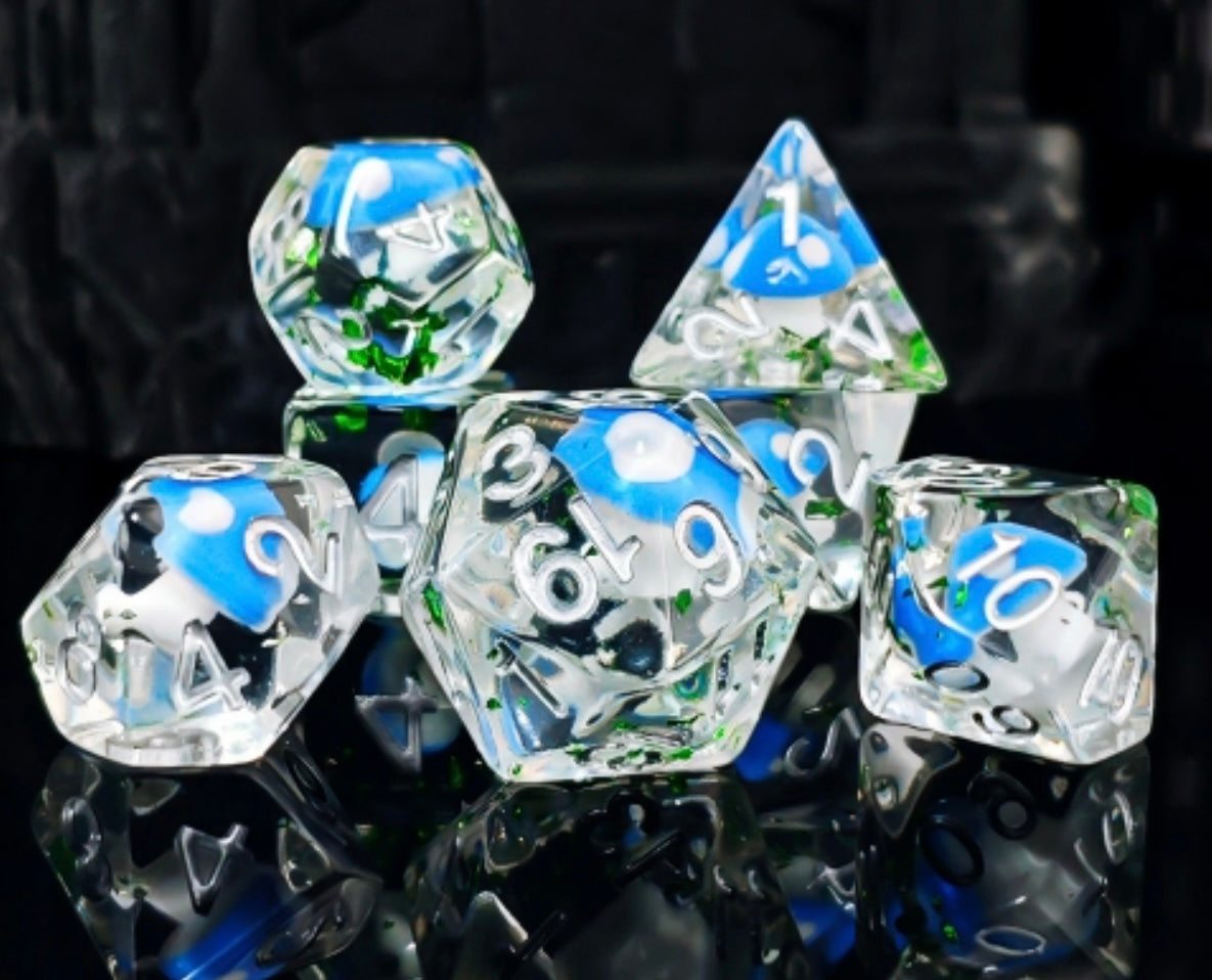 colour - clear with blue toadstool inclusions